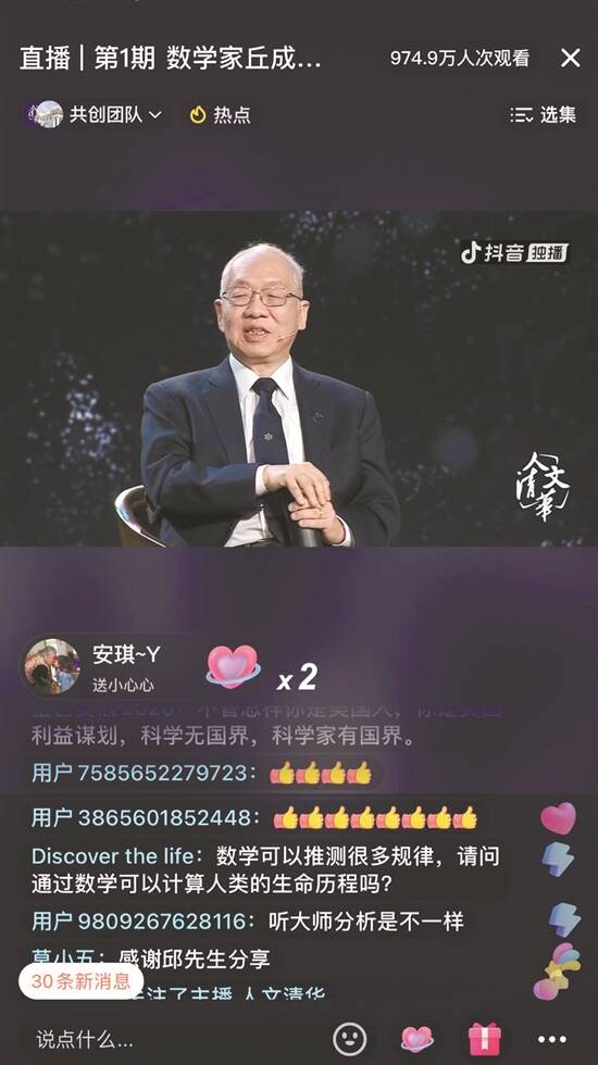 9月22日晚7时,@人文清华 直播间,人们涌来围观清华大学讲席教授丘成桐在抖音的首场公开课:“大神来了!”“人在清华,一座难求!”“就算听不懂也要来膜拜一下。” 但在这场公开课的前10分钟,这位世界著名的几何分析学科的奠基人却并未立刻进入深奥的专业授课环节。他以数学为例,平实地阐述了基础科学研究对国家发展的重要性——只有走在科研的最前端,才能不被他人“卡脖子”。弹幕里有网友感叹:“小时候总觉得学数学没用,现在才知道自己肤浅了。”