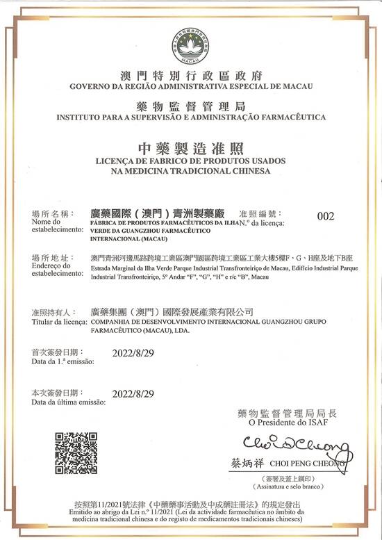 广药国际(澳门)青洲制药厂获澳门中药制造准照