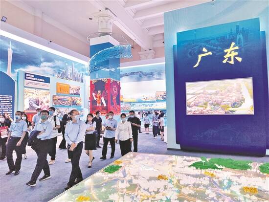 地方展区的广东单元位于北京展览馆7号馆。广东单元以“湾区蓝”为主题配色,通过图片、实物、模型、视频等展品集中展示了广东推动经济社会各领域发展取得的丰硕成果,吸引了不少观众驻足观看。