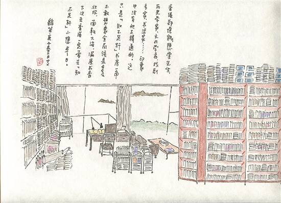 他要画我的书房,正赶上新冠疫情肆虐,没法前来香港,于是,我就对着平时工作的书桌照了张相,把左侧沿墙的一溜书架也照进去,颇有点坐拥书城的架势,寄了给他。他按照图片画了张“书房一瞥”,笔调清丽,用色淡雅,好像我读书写作的地方十分宽敞雅洁似的。