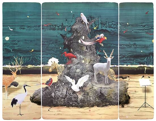 李成兴版画作品《欢乐颂》以超现实的方式营造了生命与自然和谐共生的精神乐园。“在实践的过程中,以石版画彩色套印为依托,通过不断试验,探究石版画艺术表达的更多可能性。”李长兴告诉记者,作品用石版语言对现实情景进行解构与重组,通过别样的视角将主观物象与错位域场有机组合,搭建一个虚拟的生活舞台。