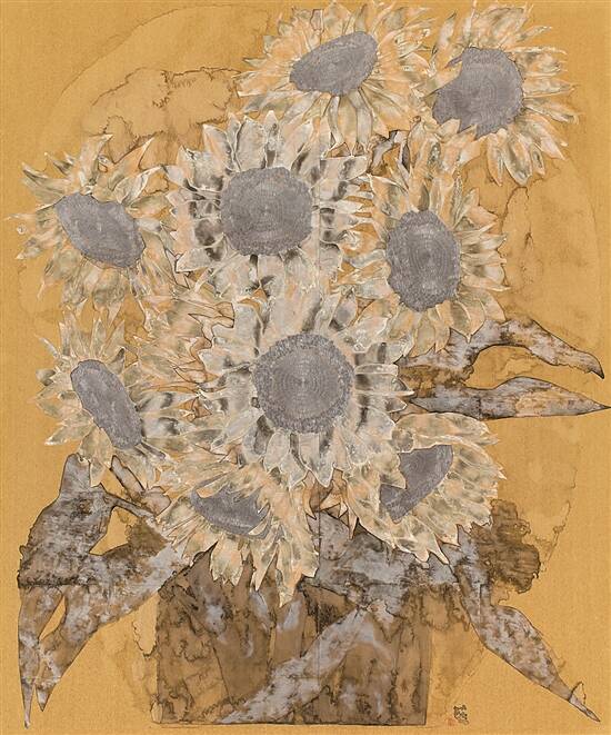 寄物兴喻,手法多元是广东美术创作的一大特点。广东省美术家协会主席、广东画院院长林蓝国画作品《蓬勃》将写意花卉绘制在金箔之上,以纤细笔触勾勒花形,融入油画技法。“以最单纯的材料,表现最纯粹的精神。”林蓝告诉记者,作画的金箔产于日本,是一种壁画材料。作画时,她用金粉调和色彩作画,花叶、花蕊以金粉堆叠而成,以呈现与时代相应的蓬勃精神与盛大美感。