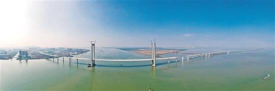 8日,随着第155片60米混凝土箱梁在广东中山智慧梁场完成预制,由中铁大桥局承建的深中通道全线非通航孔桥共791片混凝土箱梁预制工作全部完成。深中通道是集“桥、岛、隧、水下互通”于一体的超大型跨海集群工程,全长约24公里,其中桥梁工程长约17公里。图为建设中的深中通道中山大桥 文/图 新华社