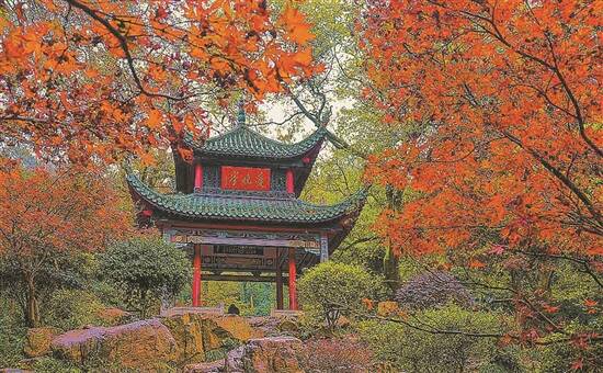持续至12月上旬时,彩叶已到湖南长沙岳麓山下。此时虽然寒冷,漫山遍野的枫香树却团团如火,簇拥着爱晚亭。枫香树属于金缕梅科。爱晚亭是毛泽东青年时代进行革命活动的场所,亭名也由他亲笔题字。因此,当我站在“爱晚亭”匾额下,看着漫山遍野的红叶,似乎也能感受到“看万山红遍,层林尽染”的豪情。