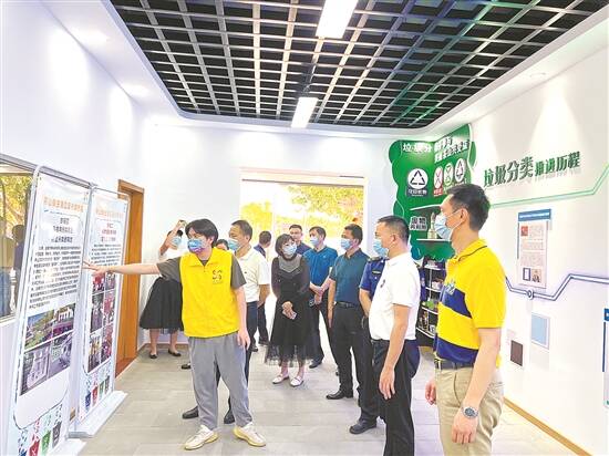 工作人员为来访嘉宾讲解茶山镇垃圾分类工作情况
