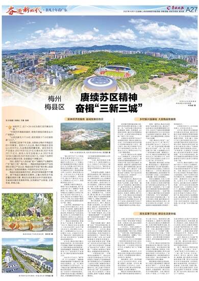 悠悠梅江延续千年文脉,也倒映出梅州市梅县区的十年蝶变。党的十八大以来,梅州市梅县区坚持以人民为中心,扎实推动高质量发展。该区地区生产总值从2012年的132.21亿元增长到2021年的237.71亿元,居民人均可支配收入从2012年的14789元增长到2021年的32467元,1386个自然村完成村庄整治任务,全部建成干净整洁村。