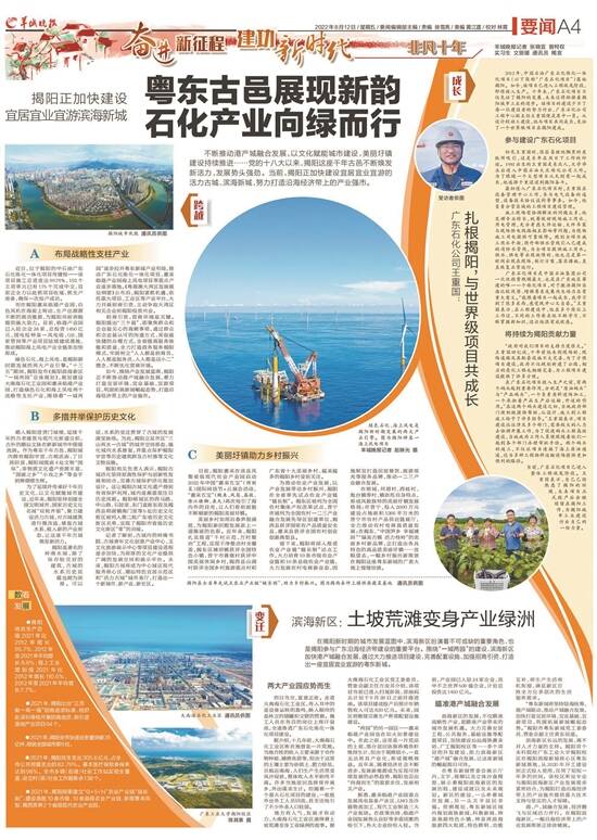 滨海新区,从无到有。一片片荒芜的土坡砂地,在大型器械的轰鸣声中,成为了现代化的产业绿洲。“一城两园”的粤东新城、大南海石化工业区与惠来临港产业园建设如火如荼。惠来海域实现广东单机容量最大的海上风机吊装,国家电投神泉一项目实现全容量并网发电,广东石化项目创造上百项国内及以上纪录……企业纷纷落户重点产业园内,炼化、风电“双龙”起舞,实现工业产值增长。