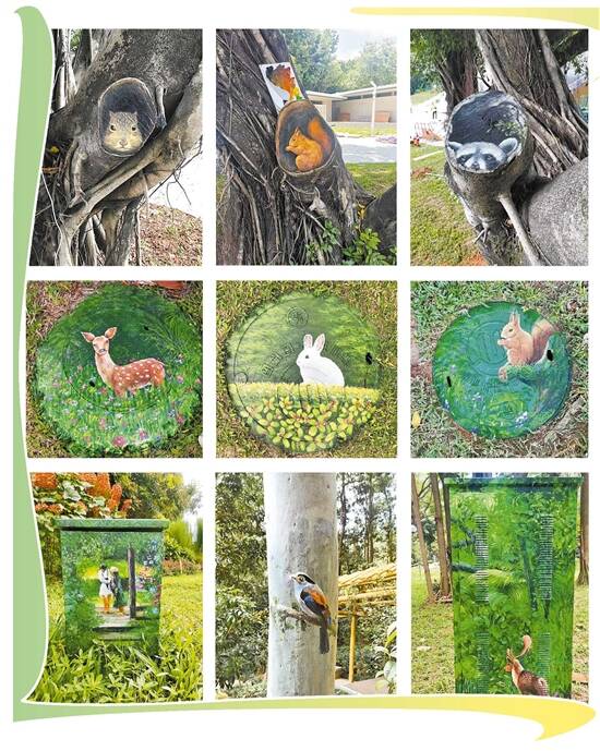 李平在深圳人民公园等公园的树上、井盖上、电箱上留下的部分绘画作品(拼版照片)