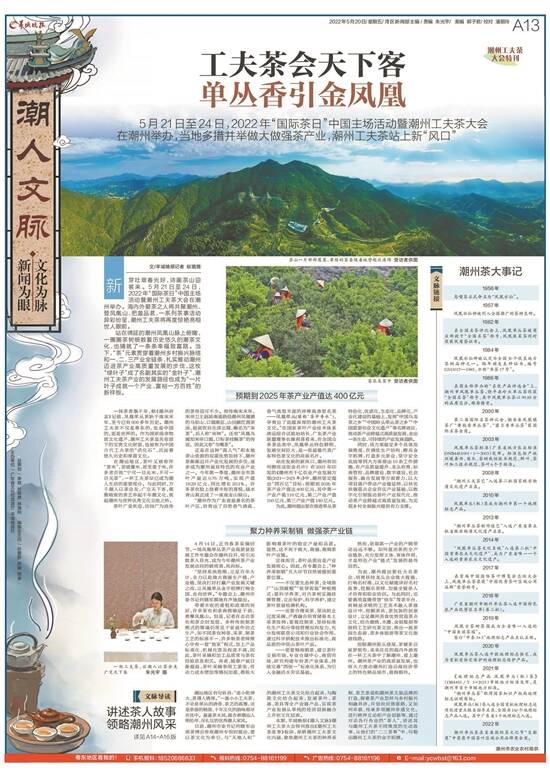 值得关注的是,今年5月,羊城晚报与潮州合作推出《潮人文脉——工夫茶故事》特别策划,围绕潮州工夫茶的前世今生、行业发展、未来走向、茶农种植、传承创新等方面深入挖掘,传承与创新潮州文脉。该特刊不仅在2022年“国际茶日”中国主场活动暨潮州工夫茶大会会场中闪亮登场,同时,在潮州牌坊街内的“潮·工夫茶宴”上,茶友们人手一份、品茗读报,让茶香更具文化味。