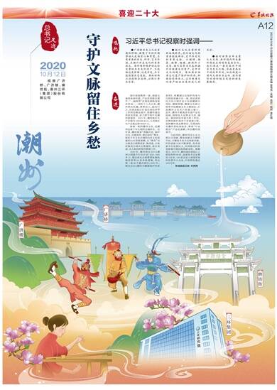 ●潮州文化具有鲜明的地域特色,是岭南文化的重要组成部分,是中华文化的重要支脉。以潮绣、潮瓷、潮雕、潮塑、潮剧和工夫茶、潮州菜等为代表的潮州非物质文化遗产,是中华文化的瑰宝。要加强非物质文化遗产保护和传承,积极培养传承人,让非物质文化遗产绽放出更加迷人的光彩。