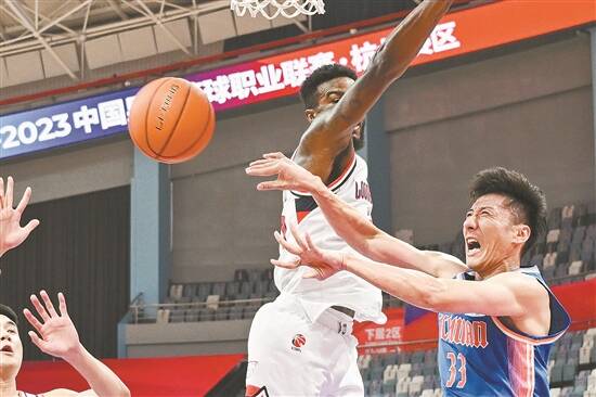 广州龙狮队球员乔丹·贝尔(左)在比赛中防守 新华社发