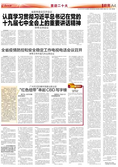 会议强调,要认真学习贯彻习近平总书记重要讲话精神和全会精神,切实把思想和行动统一到总书记、党中央决策部署上来,进一步提高政治站位,高效统筹疫情防控和经济社会发展,统筹发展和安全,全面做好广东改革发展稳定各项工作,努力保持平稳健康的经济环境、国泰民安的社会环境、风清气正的政治环境,以实际行动迎接党的二十大胜利召开。一要深刻认识过去一年党和国家各项事业之所以取得新的重大成就,党的十九大以来之所以攻克许多长期没有解决的难题,办成许多事关长远的大事要事,推动党和国家事业取得举世瞩目的重大成就,归根到底在于有总书记作为党中央的核心、全党的核心掌舵领航,在于有习近平新时代中国特色社会主义思想的科学指引,深刻领悟“两个确立”的决定性意义,增强“四个意识”、坚定“四个自信”、做到“两个维护”,更加坚定自觉紧跟总书记、奋进新征程。二要扎实做好党的二十大广东代表团参会组织工作,确保高质量完成大会各项任务。组织代表深入学习贯彻习近平新时代中国特色社会主义思想,认真学习贯彻总书记在十九届七中全会上的重要讲话精神,以高度的政治责任感和历史使命感认真履职尽责。认真做好代表团会务组织工作,严格落实疫情防控各项措施,严格会风会纪要求,确保万无一失。三要全面落实疫情要防住、经济要稳住、发展要安全重要要求,为党的二十大胜利召开营造良好环境。毫不动摇坚持“外防输入、内防反弹”总策略和“动态清零”总方针,从严从紧从细从实抓好疫情防控各项工作,牢牢守住不发生规模性疫情的底线。落实好国家稳增长系列政策,供给需求两手抓,投资消费进出口齐发力,确保经济运行在合理区间。要扎实做好社会矛盾排查化解、安全生产和防灾减灾等工作,切实防范化解各类风险,确保社会大局平安稳定。四要谋划做好党的二十大精神学习宣传贯彻工作。组织广大干部群众认真收听收看大会新闻报道,组织全省各类媒体扎实做好大会宣传报道,迅速兴起学习宣传贯彻高潮。