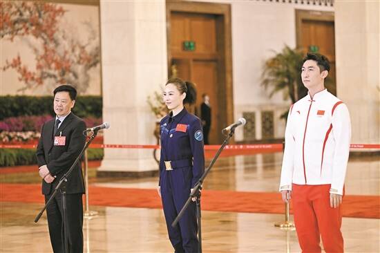 朱有勇、王亚平、武大靖代表(自左至右)接受采访 新华社发