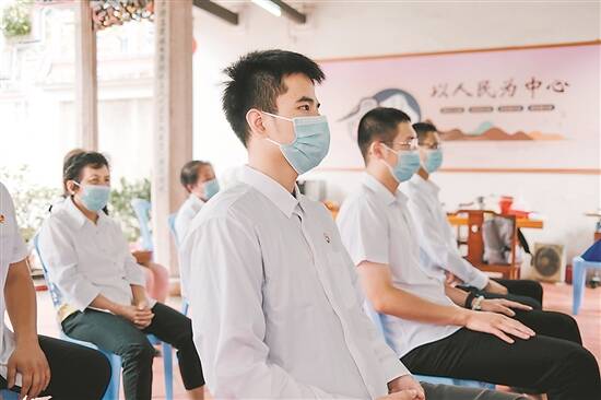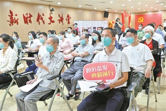 潮州市湘桥区开元社区党群服务中心内,党员群众认真收看党的二十大开幕会直播 羊城晚报记者 何奔 摄