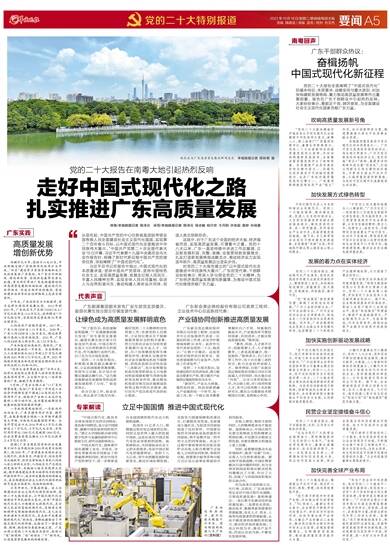 对党的二十大报告提出的“以中国式现代化全面推进中华民族伟大复兴”,广东的党代表、干部群众纷纷表示,将深入学习领会党的二十大精神,为广东经济高质量发展谱写新篇章、为推动中国式现代化继续贡献广东力量。