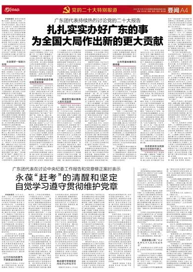 羊城晚报讯 10月18日,党的二十大广东省代表团举行分组会议,对十九届中央纪律检查委员会的工作报告和《中国共产党章程(修正案)》展开热烈讨论。大家积极发言,一致认为中央纪委工作报告总结成绩实事求是,揭示规律深刻管用,提出建议务实合理,顺应党心民意,弘扬清风正气,郑重宣示了我们党以永远在路上的清醒和坚定推进党风廉政建设和反腐败斗争的坚强决心;党章修正案充分体现了马克思主义中国化时代化的最新成果,充分彰显了党的工作和党的建设的新鲜经验,必将对推进党的事业和党的建设发挥更好的规范和指导作用。