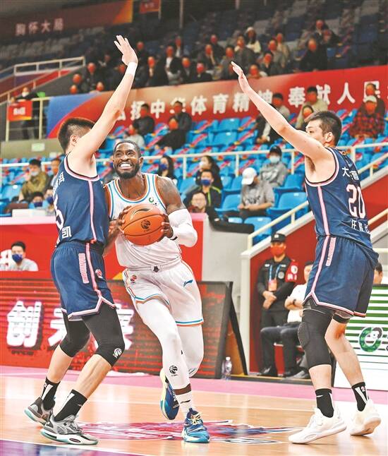 广东队球员王薪凯(左)、任骏飞(右)防守保罗 新华社发