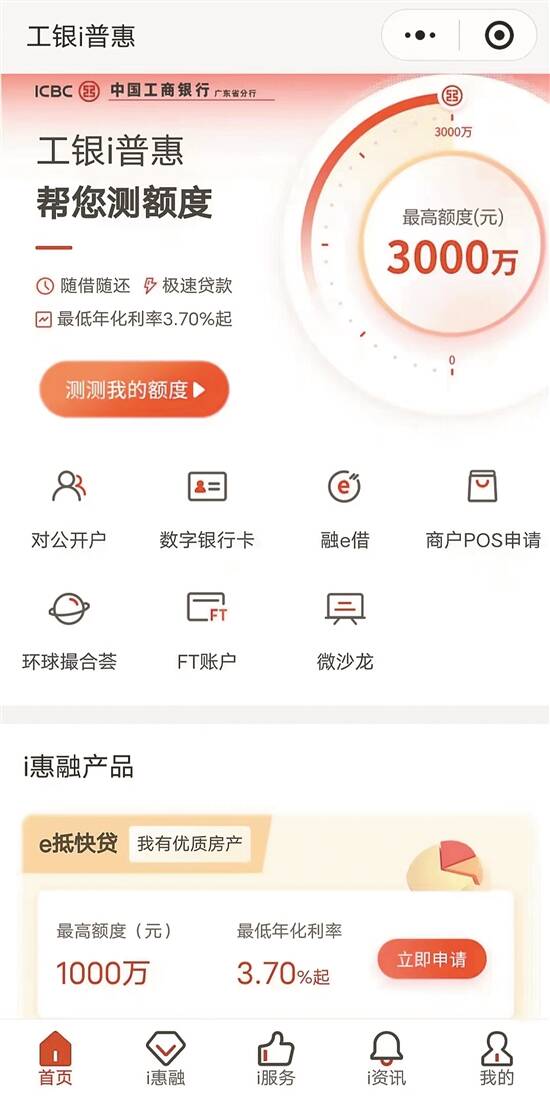为满足客户足不出户,线上办理普惠业务的需求,广东工行已推出“工银i普惠”微信小程序,客户可以通过该小程序实现在线测额,在线了解工行相关产品介绍,并在线提交融资需求及业务申请,进一步提升贷款效率。