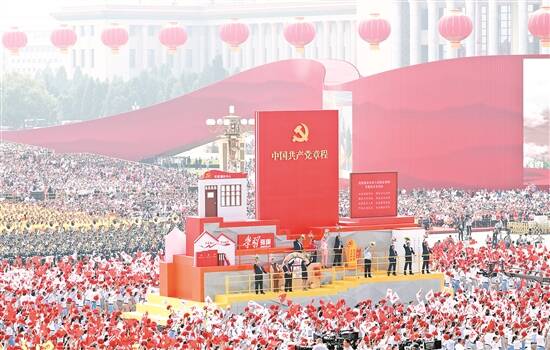 2019年10月1日上午,庆祝中华人民共和国成立70周年大会在北京天安门广场隆重举行。这是群众游行中的“从严治党”方阵 新华社发