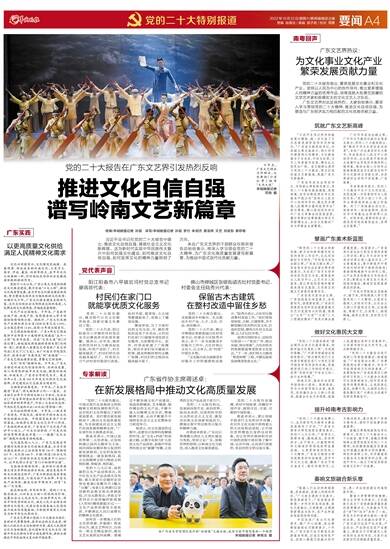广东文艺界对此反响热烈。大家纷纷表示,要深入学习贯彻党的二十大精神,推进文化自信自强,为塑造与广东经济实力相匹配的文化优势贡献力量。