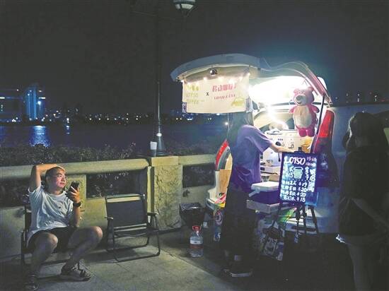 每天晚上六七时,手磨咖啡档的吕小姐都会准时“到岗”,白天在企业打工,夜晚来兼职摆摊,相较于按部就班式的打卡上班,在她看来,年轻人聚集的车尾箱集市显得更加自由随意。“赚得不多,当玩一样,这是一种年轻的生活方式。”