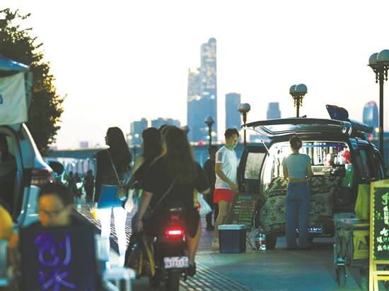 和吕小姐一样,越来越多摊主将车尾箱集市作为新的社交方式。网红主播黄小姐每天下班就来到江边,支起直播架,打开美颜灯,一场介绍夜市的才艺直播就此开始。“可以带网友打卡这里的夜市生活,可以在围观的路人中结识新朋友。”