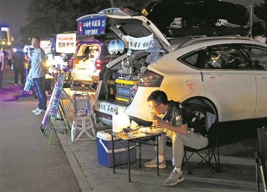 天色渐暗,帐篷渐渐“收帆”,车尾箱夜市开始“布展”