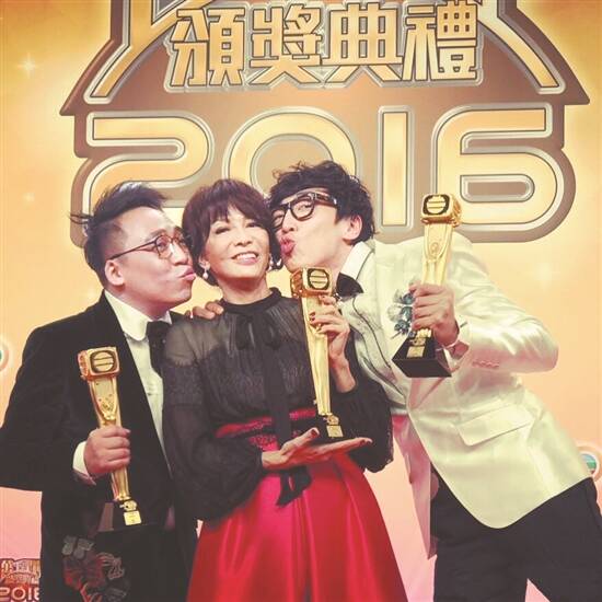 农夫组合与郑裕玲(中)曾共同主持电视节目,并在《万千星辉颁奖典礼》上获奖