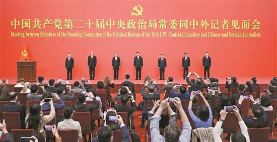10月23日,刚刚在中国共产党第二十届中央委员会第一次全体会议上当选的中共中央总书记习近平和中共中央政治局常委李强、赵乐际、王沪宁、蔡奇、丁薛祥、李希在北京人民大会堂同采访中共二十大的中外记者亲切见面 新华社发