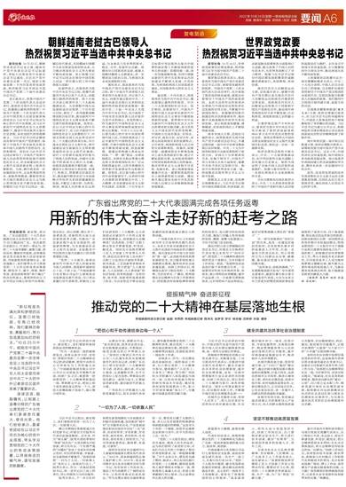 谆谆话语、殷殷嘱托,让刚踏上返粤归程的广东省出席党的二十大代表们更感责任重大、使命光荣。他们纷纷表示,要紧密团结在以习近平同志为核心的党中央周围,带头学习贯彻党的二十大作出的各项决策部署,以昂扬奋进的精气神,谱写发展的新篇章。