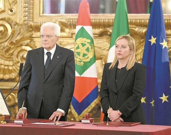 意大利总统马塔雷拉(左)和新任总理焦尔吉娅·梅洛尼出席宣誓就职仪式 新华社发