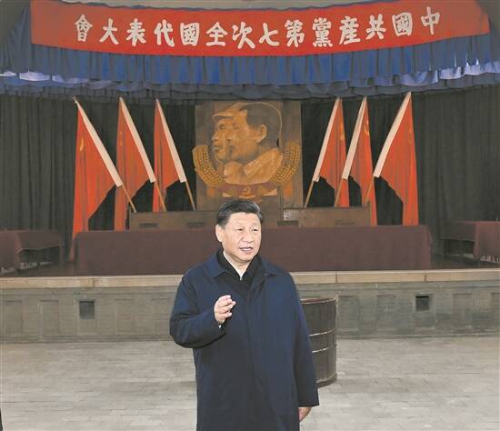 习近平等首先来到中共七大会址。1945年4月至6月党的七大在这里召开。我们党成立时只有50多名党员,到党的七大召开时已经拥有了121万名党员。习近平缓步瞻仰会场,他表示,党的七大在党的历史上具有重要里程碑意义,标志着我们党在政治上思想上组织上走向了成熟。在政治上,党通过延安整风,使全党团结在毛泽东的旗帜下,实现了党的空前统一和团结。在思想上,党确立了毛泽东思想在全党的指导地位,把毛泽东思想写入了党章。在组织上,党形成了一支高举毛泽东旗帜的久经考验的政治家集团。党的七大在党的历史上具有极其重要的地位,为党后来不断从胜利走向胜利指明了正确方向、开辟了正确道路。