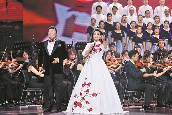 崔峥嵘(右)、张学樑演唱压轴歌曲《高歌奋进向未来》
