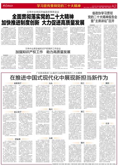 会议强调,省委教育工委、省教育厅要把学习宣传贯彻党的二十大精神作为当前和今后一个时期的首要政治任务,持续兴起学习宣传贯彻党的二十大精神热潮。精心组织、周密安排,推进学习宣传贯彻各项工作,全覆盖、立体式学习宣讲,高标准、高质量研究阐释,一步一个脚印把党的二十大作出的重大决策部署付诸行动、见之于成效。委厅全体党员干部要原原本本、原汁原味学习好党的二十大精神,率先联系实际破解制约教育高质量发展的矛盾问题,团结带领全省教育系统把党的二十大精神落实到教育改革发展各方面、全过程,以更坚定的决心、更强烈的担当、更扎实的作风推动党的二十大精神在广东教育系统落地生根、结出硕果。