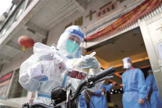这名“大白”名叫蒙成树,是一名志愿者。近期,他每天都骑着电动车穿梭在广州市白云区均禾街罗岗村的大街小巷,为中高风险区域和临时管控区域内的居民配送药品。