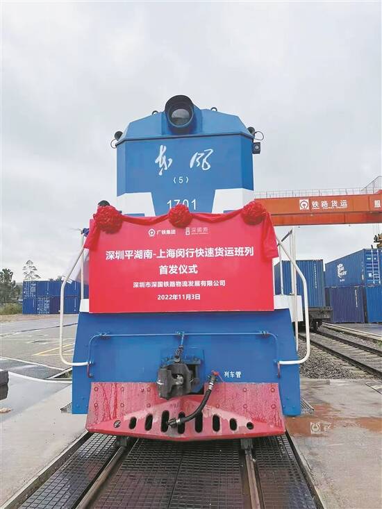 羊城晚报讯 记者李志文,通讯员韩逸、齐姣影、张赟摄影报道:11月3日,随着一声汽笛长鸣,一列满载电子产品、饮料、塑料粒等商品的X8608次快速货运班列从广铁集团深圳平湖南铁路物流园缓缓驶出(上图),预计约26小时后抵达上海闵行站。这是深圳开往上海的首趟快速货运班列,标志着粤港澳大湾区与长江经济带又开辟了一条全新的铁路物流通道。