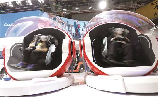 上图:11月5日,参观者在第五届进博会技术装备展区体验一款VR游戏座椅 新华社发