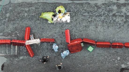 6日,广州市海珠区大塘村内,工作人员隔着水马传递物资 羊城晚报记者 梁喻 宋金峪 摄