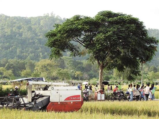 羊城晚报讯 记者林翎,通讯员袁旺、钟轩、刘文华摄影报道:秋高气爽,灿烂的阳光洒在中山市三乡镇桥头村成片晚稻田上,满目金黄,稻香四溢。在充满诗情画意的稻田里,除了正在田里忙着收割的村民,还不时可以见到三五游人在田里摄影、游览,尽情享受这“稻花香里说丰年”的乡村之乐。时下,中山乡村的稻田已由传统的农耕场所华丽转身,成为集农耕、旅游、文化于一身的网红景点,成为乡村振兴的助推器。