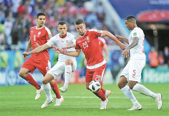2018俄罗斯世界杯小组赛,塞尔维亚和瑞士球员在拼抢中 图/视觉中国
