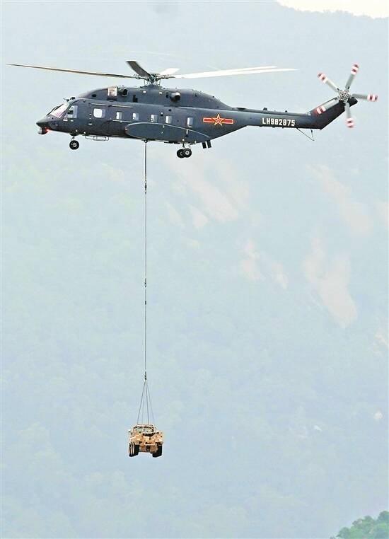 陆军空中突击力量直8L吊装山猫全地形车