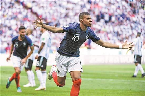 姆巴佩在2018年世界杯对阿根廷的比赛中庆祝进球 本版图片/视觉中国