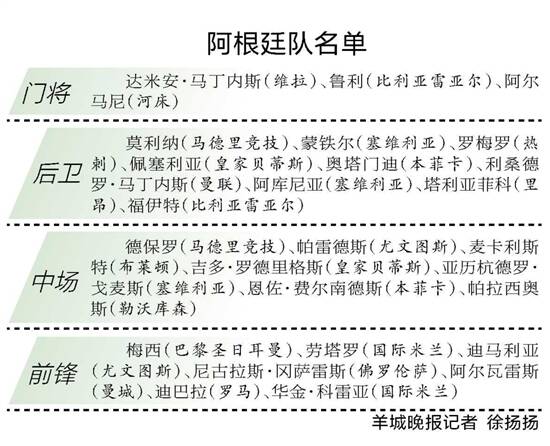 阿根廷几乎就是一个“海外兵团”,绝大多数球员在欧洲五大联赛的俱乐部踢球,其中西甲多达9人,意甲6人,英超5人,法甲、葡超各2人,德甲1人。此前有伤的迪巴拉和迪马利亚最终上榜,情况类似的洛塞尔索和安赫尔·科雷亚则落选。