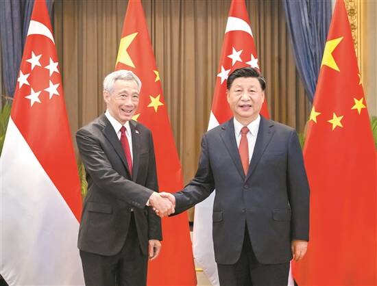 习近平指出,面对世纪疫情和百年变局,中新关系发展势头良好,不仅助力两国抗疫和经济复苏,而且为地区稳定和繁荣注入了正能量。中新关系具有前瞻性、战略性和示范性。中共二十大对中国全面建设社会主义现代化国家、全面推进中国式现代化作出了战略部署。中方愿同新方携手推动两国与时俱进的全方位合作伙伴关系不断取得新进展。