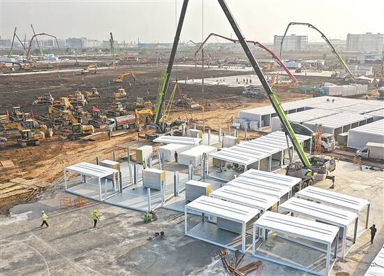 17日下午,广州南沙健康驿站建设现场,陆续有板房开始组装 羊城晚报记者 汤铭明 摄