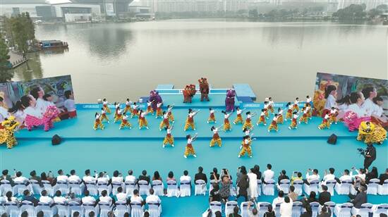 羊城晚报讯 记者张闻、吴泳、何昱摄影报道:11月18日上午,“艺术在樵山-广东南海大地艺术节2022”于佛山市南海区西樵镇听音湖龙舟广场开幕。