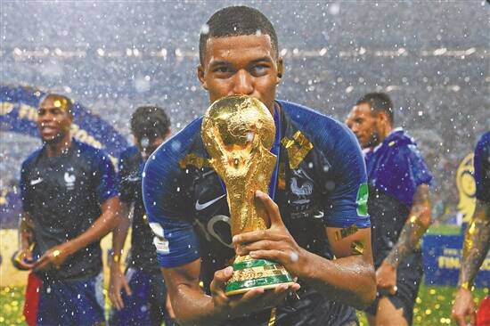2018年俄罗斯世界杯,法国夺冠,姆巴佩亲吻大力神杯 图/视觉中国