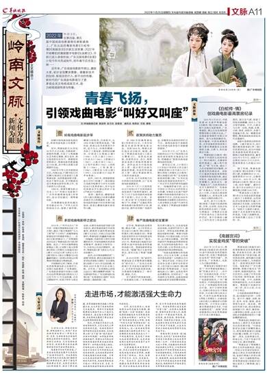 “戏曲电影跟舞台的戏曲演出,可以互补生辉,让戏曲美学普及到更广大的群众当中去。”著名评论家、中国文艺评论家协会原主席仲呈祥曾评价,《花月影》《白蛇传·情》《柳毅奇缘》等粤剧电影、广东汉剧电影《白门柳》,这些优秀作品各擅胜场,共同形成了一道亮丽的文化景观,这就是南国戏曲电影所呈现的繁荣景象。