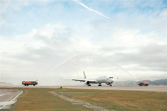 机场举行射水礼欢迎第三跑道正式启用后首班抵港航班 香港国际机场供图