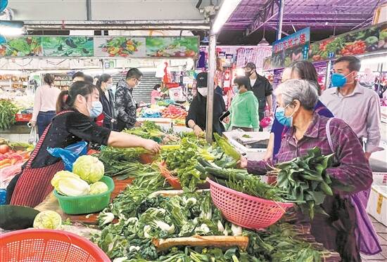 26日上午,广州市天河区华景新城铁路肉菜市场,顾客购买新鲜蔬菜 羊城晚报记者 梁怿韬 摄